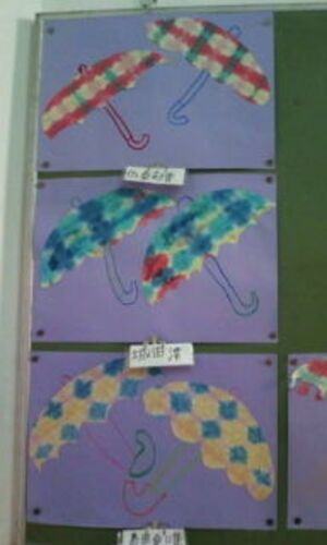 折り染めした紙を、ちゃっぷんちゃっぷんと切って傘の形を二つ作り、台紙に貼って作品完成。 台紙はもうちょっと濃いめの色にしたらよかったなと後悔。 初めて書いた習字の一とともに掲示。 これで日曜参観の掲示ができあがりました。 あとは、授業の流れを…