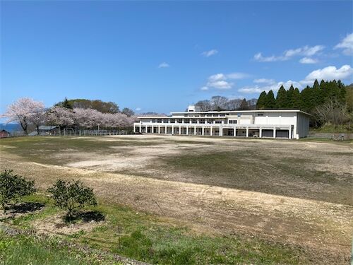 山から一気に下りてきた。 廃線跡をこのまま辿るか、海沿いをいくか、最後まで迷ったのですが、海を選びました。 トンネルはもういいかなと思ったからです。 やっぱり怖いですしね。 学校は、運動場がこんな感じでしたので、閉校したのかなと思いました。 門…