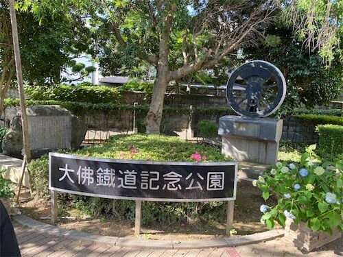 帰り道、ふと見ると大佛鐵道の文字が見えました。 えっ、あの幻の鉄道です。 こんなところを通っていたのかー。 この辺りに大仏駅があったそうです。 今から100年以上前、たった9年間ほどしか走っていなかった鉄道です。
